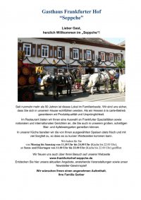 Gasthaus Frankfurter Hof “Seppche” Getränke Alkoholfreie Getränke Glas Wasser Coca-Cola 1, 2 Coca-Cola 1, 2 Orangenlimonade 1, 2 Orangenlimonade 1, 2 Zitronenlimonade 1, 2 Zitronenlimonade 1, 2 Spezi 1,2 Spezi 1,2 Apfelsaft Apfelsaft Apfelschorle Apfelschorle Orangensaft 100% Kleine Flasche Coca-Cola Zero 2,6,13 Kleine Flasche Bitter Lemon 14 Kleine Flasche Wasser Große Flasche Wasser Kleine Flasche stilles Wasser Große Flasche stilles Wasser Flasche gelbe oder weiße Limonade (nur zum Bembel) 0,4 l 0,4 l 0,2 l 0,4 l 0,2 l 0,4 l 0,2 l 0,4 l 0,2 l 0,4 l 0,2 l 0,4 l 0,2 l 0,2 l 0,2 l 0,2 l 0,25 l 1,00 l 0,25 l 1,00 l 1,00 l 3,00 € 4,40 € 2,90 € 4,40 € 2,90 € 4,40 € 2,90 € 4,40 € 2,90 € 4,40 € 2,90 € 4,40 € 2,90 € 2,90 € 2,90 € 2,90 € 2,70 € 5,50 € 2,70 € 5,50 € 7,90 € Bitte haben Sie Verständnis, dass wir für ein „Doggy Bag“ einen Verpackungs-Aufpreis von 0,50 € nehmen müssen. Alle Preise inkl. Mehrwertsteuer. www.frankfurterhof-seppche.de